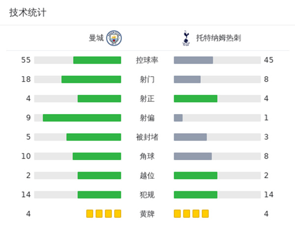 全场比赛结束,曼城3-3热刺。