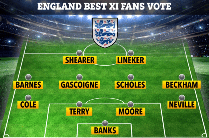 阵型是传统的442阵型,门将位置上是英格兰传奇门将班克斯;后防线上左后卫位置上是阿什利科尔,右后卫位置上是加里内维尔;中后卫组合是特里和博比-摩尔。而中场方面,两个中前卫分别是斯科尔斯和加斯科因,左边路是约翰-巴恩斯,右边路是大卫-贝克汉姆。而前锋线组合是莱因克尔搭档希勒。而现役球星,没有一人能够入选这个阵容。(阿什利科尔去年才宣布退役)