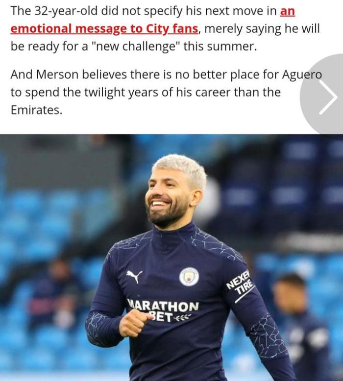 报道称,阿圭罗并没有明确表示自己的下家,只是说他为今年夏天的新挑战做好了准备。默森在接受《天空体育》采访时谈到此事时,表示:“阿圭罗会选择留在英格兰还是离开?如果他选择留在英格兰,我认为阿森纳会是很好的选择,那里有适合他的踢球风格。阿尔特塔在曼城(助理教练)和阿森纳都待过,他的球队围绕禁区创造了很多机会,阿圭罗会合得来的。”