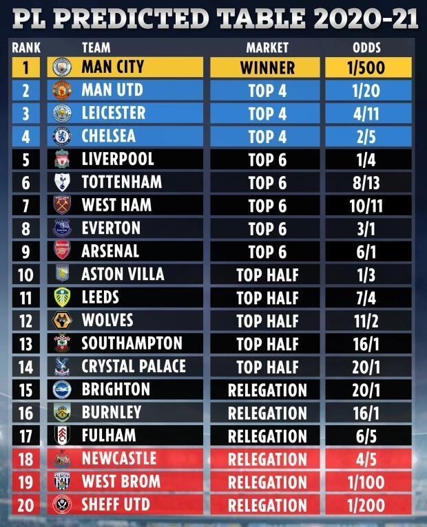 曼城将最终夺冠,赔率为1/500;随后依次是曼联、莱斯特、切尔西,三队进入前四的赔率分别为1/20、4/11、2/5;