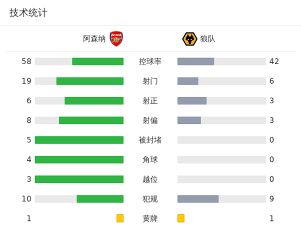 关键事件: 第6分钟,富安健洋送出直传,萨卡扣过防守球员低射得手,阿森纳1-0狼队。