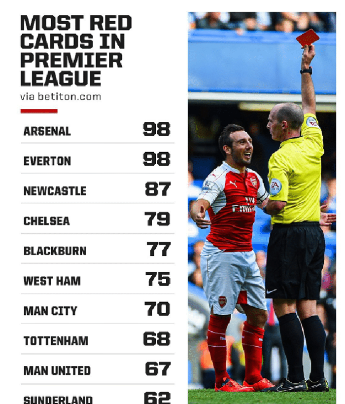 JRS直播网讯 在足球场上,任何球队都不希望自己的队员被红牌罚下,因为一旦出现这种情况,就表示球队要少一人应战。不过,即便如此,不少球队依然吃到了不少红牌,那么在足坛最受关注的英超赛场上,哪些球队拿到了红牌最多呢?近日,就有英格兰媒体统计了英超历史上,各大球队拿到红牌数量的排行,其中阿森纳和埃弗顿并列第一,而曼联则排名第九!