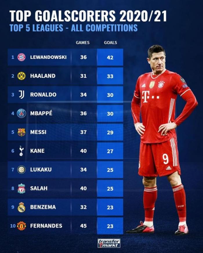 JRS直播网讯北京时间3月27日,转会市场统计了目前欧洲五大联赛球员的俱乐部赛事进球榜。前五位分别为莱万、哈兰德、C罗、姆巴佩和梅西。