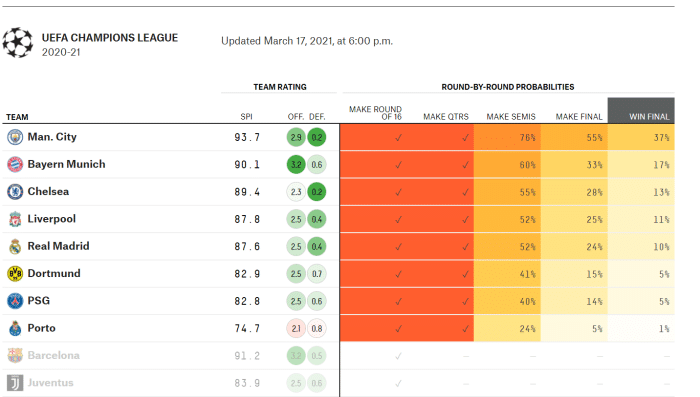 JRS直播网3月18日讯 随着欧冠八分之一决赛全部的结束,欧冠八强球队也全部出炉了,曼城、拜仁、切尔西、利物浦、皇马、多特、巴黎和波尔图八支球队晋级本赛季欧冠八强。而这八支球队进入八强之后,所有媒体也都开始猜测,到底谁能拿到本赛季欧冠冠军呢?而近日,欧洲权威数据媒体网站“538”利用大数据预测了本赛季欧冠夺冠的几率,其中曼城是独一档的存在,他们是最被看好的球队,而上赛季欧冠冠军拜仁的夺冠几率甚至不及曼城的一半。