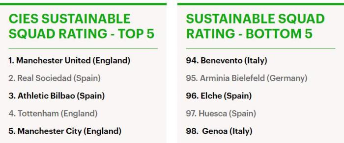 但这份榜单再往下看,红魔拥趸的心可能凉了半截,因为排名第二和第三的是西甲的皇家社会和毕尔巴鄂。而英超对手热刺和曼城,则位列第4和第5位。