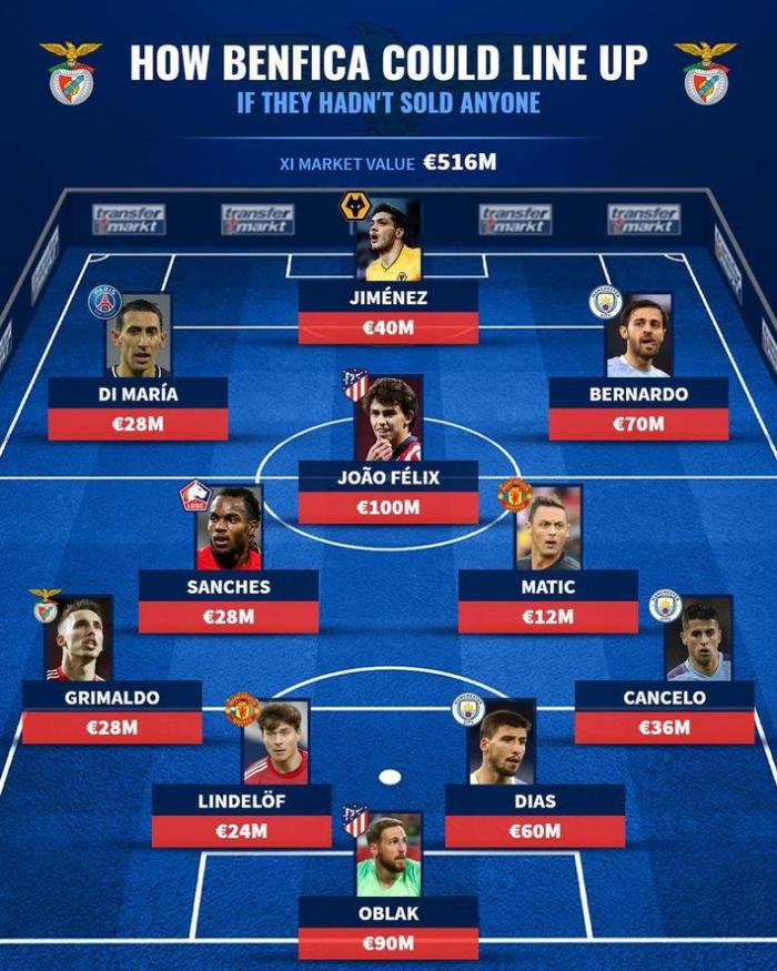 JRS直播网3月14日讯 转会市场网本周列出了效力过本菲卡的现役球员最佳阵,奥布拉克、菲利克斯、贝尔纳多-席尔瓦等人入选,11名球员当前的总身价高达5.16亿欧元。
