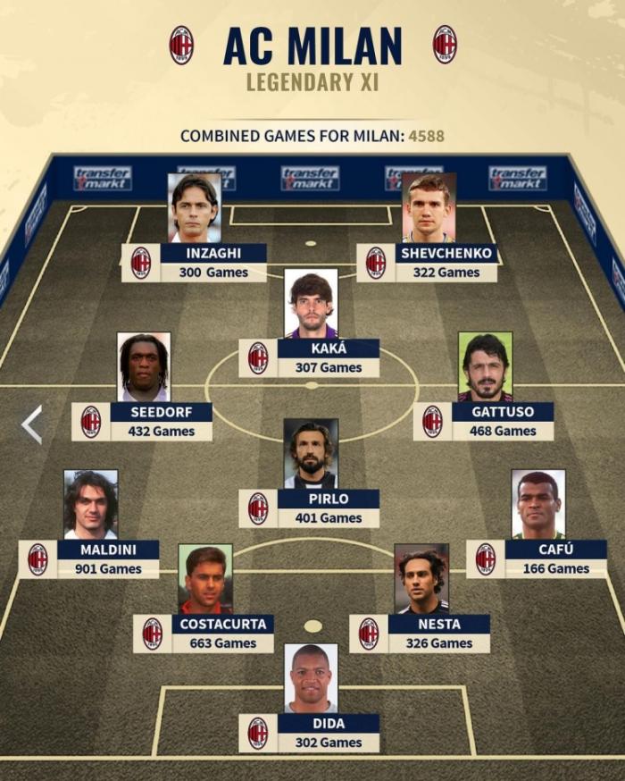 而米兰方面的最佳阵容是442菱形中场的阵容,门将位置上是出场302次的迪达。后防线上分别是出场901次的马尔蒂尼,出场663次的科斯塔库塔,出场326次的内斯塔和出场166次的卡福。中场方面分别是出场401次的皮尔洛,出场432次的西多夫,出场468次的加图索和出场307次的卡卡。而前锋组合是出场300次的因扎吉和出场322次的舍普琴科。