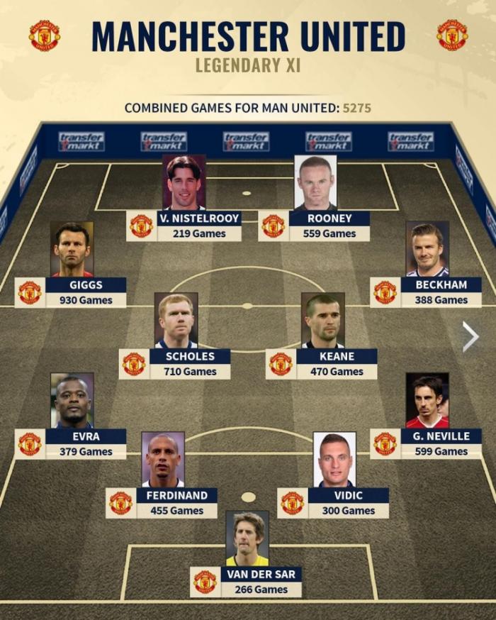 这次评选完全是按照各位置球员出场次数评选的,曼联方面是经典的442阵容,门将位置上是出场266次的范德萨,后防线是分别是出场379次的埃弗拉,出场455次的费迪南德,出场300次的维迪奇和出场599次的加里内维尔。中场方面是出场930次的吉格斯,出场710次的斯科尔斯,出场470次的基恩和出场388次的贝克汉姆。而前锋线上分别是出场219次的范尼和出场559次的鲁尼。