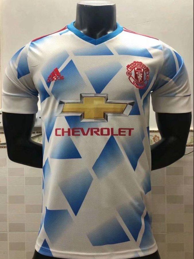 与此同时,曼联下赛季的客场战袍款式率先曝光,据社交网站泄密的图片显示,曼联下赛季将身披白色底色、黑色花纹的战袍征战赛场。球衣采用复古的90年代风格外观,与1990年到1992年曼联复兴期间身披的白色客场战袍有着类似之处。区别之处在于,新球衣的花纹更大,没有那么密集。