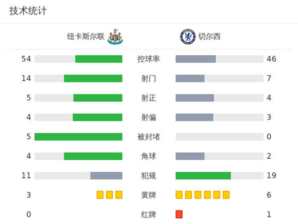 全场比赛结束,最终切尔西1-4纽卡斯尔。