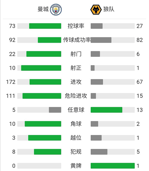 查看:曼城vs狼队 全场录像技术统计: