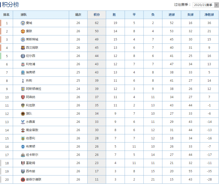 JRS直播网3月2日讯 2020-21赛季英格兰超级联赛第26轮的比赛结束了,本轮比赛,曼联和切尔西打平了,而曼城则取得了各项赛事的20联赛,而曼城领先第二名曼联的优势也扩大到了12分,可以说他们夺冠在望了。而利物浦和热刺在连败之后,也相继赢球了,他们似乎也开始为争四发力了。而后面的英超比赛,可能会更加精彩了,而英超争四大戏,正式上演。