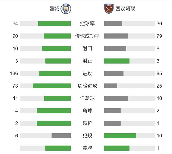 曼城2-1西汉姆 迪亚斯头槌斯通斯建功