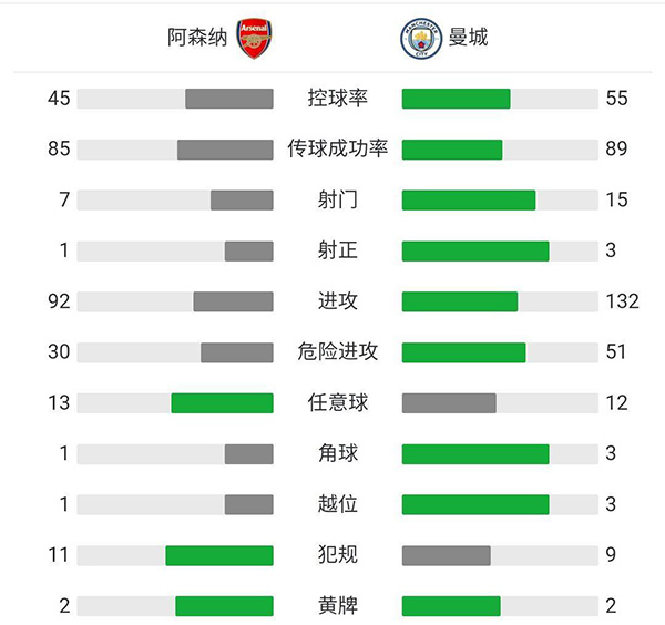 4分钟补时后全场比赛结束,最终阿森纳主场0-1不敌曼城。