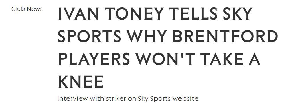 上周,布伦特福德官方发布公告称不再进行赛前跪地仪式,俱乐部前锋伊万-托尼表示非常支持。托尼说:“关于这件事我们讨论了很久,每个人都同意取消这个仪式。我们跪了那么久,但没有造成任何改变。”