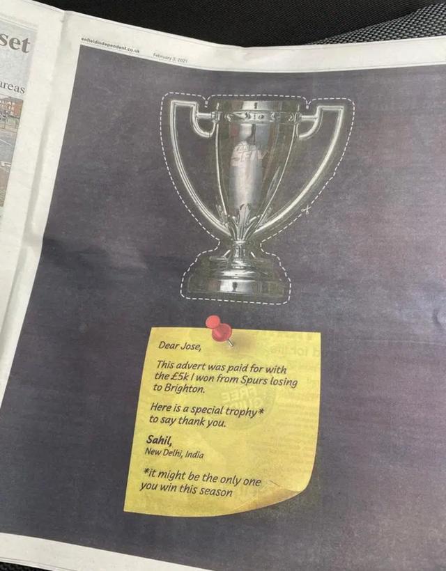 热刺在上轮联赛中0-1爆冷不敌布莱顿,29岁的印度球迷萨利在梦幻足球中下注布莱顿赢球,赢得了5000万英镑,在拿到奖金之后,他特地到伦敦当地的《恩菲尔德独立报》刊登整版广告,嘲讽穆里尼奥。