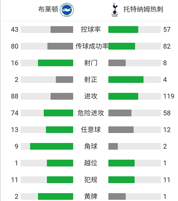 查看:布莱顿vs热刺 全场录像技术统计: