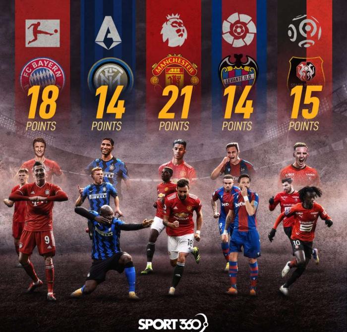 如图,曼联是本赛季欧洲五大联赛赛场上通过逆转获得积分最多的球队,曼联通过逆转一共拿下了21分,是英超通过逆转获得积分最多的球队,而英超赛场上排名第二的利物浦,不过通过逆转拿到了10分。可见曼联球员的精神属性多强大。而排名第二的是德甲的拜仁,拜仁本赛季开局表现不佳,随后逐渐找到了状态,而他们现在赢球的方式也是靠逆转,拜仁通过逆转拿到了18分,是欧洲赛场上通过逆转得分第二多的球队。