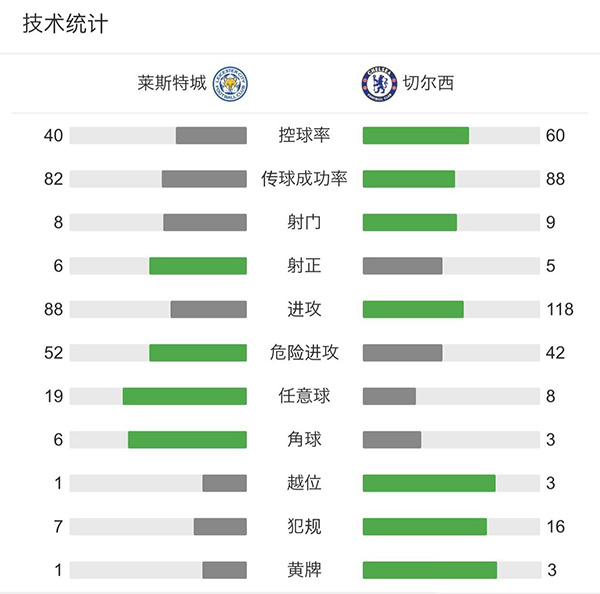 查看:莱斯特城vs切尔西 全场录像技术统计: