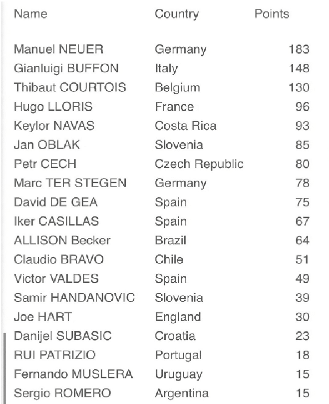 而诺伊尔和布冯身后是库尔图瓦,他拿到了130分,第四是洛里斯的96分,第五是纳瓦斯的93分,随后是奥布拉克的85分,切赫的80分,特尔施特根的78分,德赫亚的75分,卡西的67分。后面的大家可以自己看,基本上都是足坛有名的名将,大家应该都认识了。他们都有属于自己的一段时间,只不过巅峰期的时间和表现,不如布冯和诺伊尔就是了。