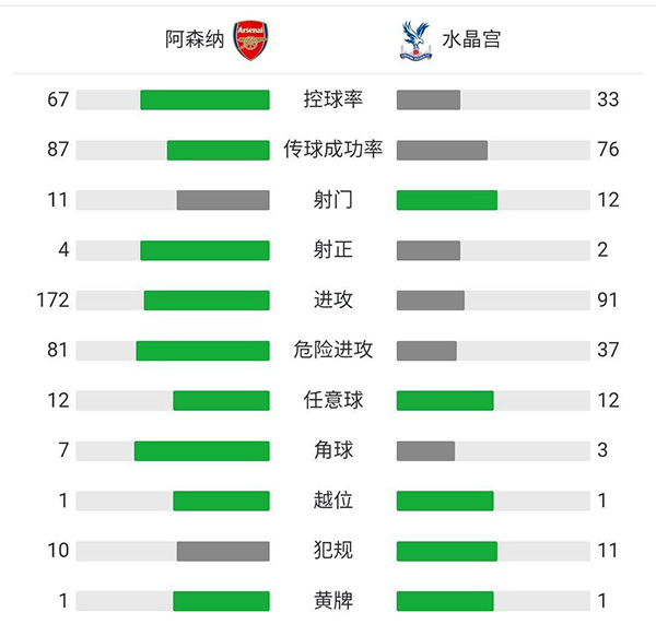 查看:阿森纳vs水晶宫 全场录像技术统计: