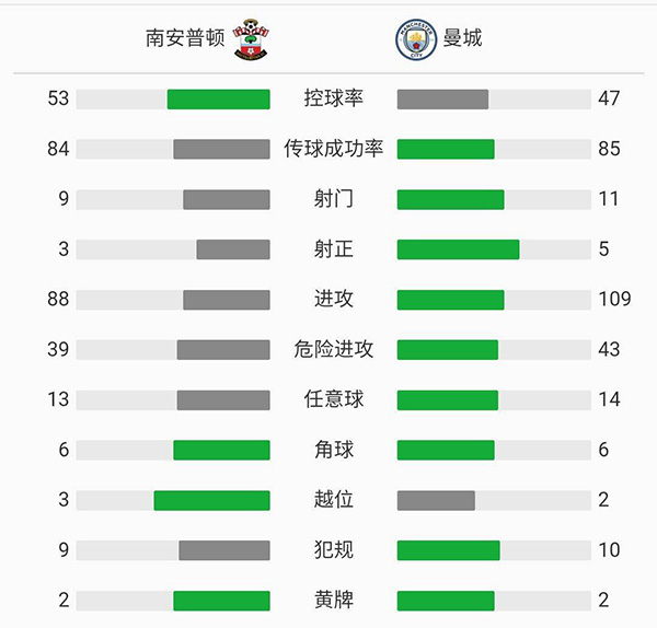 查看:南安普顿vs曼城 全场录像 技术统计: