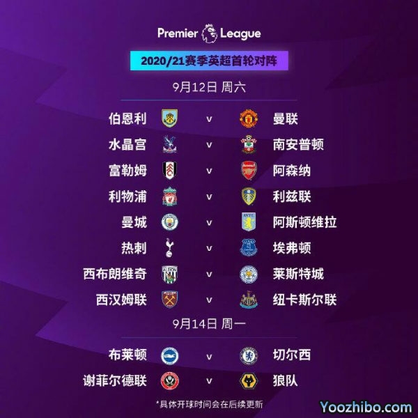 北京时间8月21日JRS直播网讯,英超官方正式公布了2020-21赛季的联赛日程安排。第一轮从9月12日开战,卫冕冠军利物浦首轮对阵时隔十六年重返英超的利兹联,克洛普大战贝尔萨,热刺则将在主场迎战埃弗顿。整个赛季于2021年5月23日周日结束。注:日期为当轮比赛预定开始的日期(英国时间)。