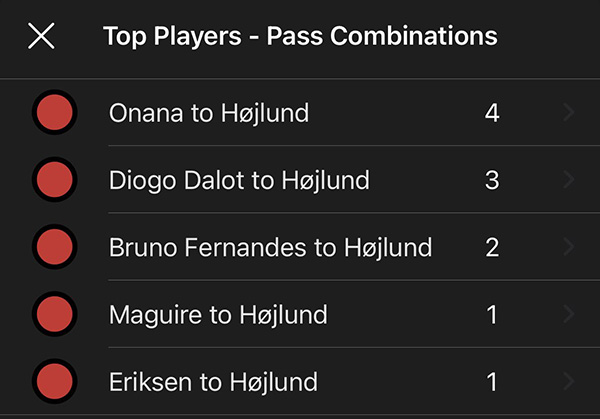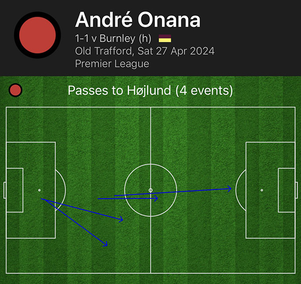 但一项数据也许体现了曼联进攻打法的不正常之处,数据显示,在场上的65分钟内,中锋霍伊伦德得到传球的最大来源竟是门将奥纳纳,27岁的喀麦隆国门4次传球给霍伊伦德,领先于边卫迪奥古·达洛,后者传了3次。中场核心布鲁诺·费尔南德斯给霍伊伦德的传球只有2次,马奎尔和埃里克森各有1次。