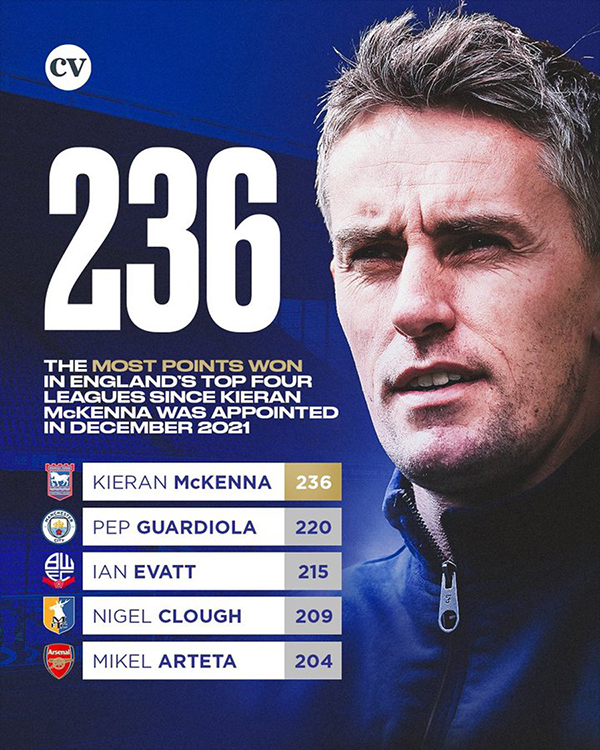 在从英甲和英冠升级过程中,麦肯纳的伊普斯维奇都没有夺冠,但他们经常横扫对手,赏心悦目的比赛风格赢得了好评如潮。除了一两个新援,如奥马里·哈钦森和基弗·摩尔,麦肯纳一直坚持使用英甲升级时的球员,他的教练方法使球队发挥出了最佳水平。数据显示,成为主帅后的麦肯纳带队拿到236个积分,比曼城的瓜迪奥拉更高。