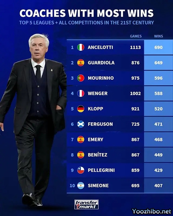 JRS直播网讯 21世纪五大联赛球队主帅获胜场次数排行榜