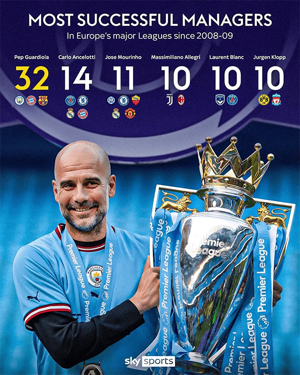 JRS直播网讯 天空体育统计了自08-09赛季后,欧洲主要联赛的教练冠军荣誉。