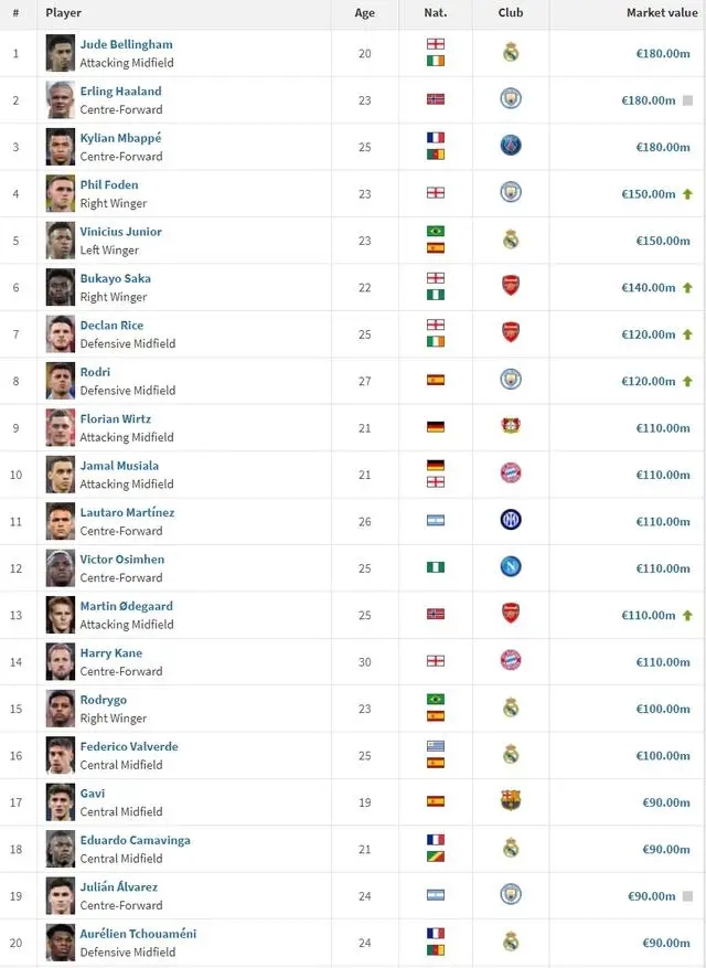 JRS直播网讯 德转英超身价前10公布,哈兰德1.8亿欧领跑,福登1.5亿欧排在第二。