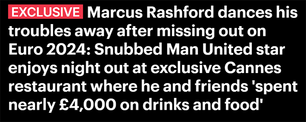 赛季的低迷表现,让拉什福德最终落选英格兰队的欧洲杯26人大名单。有球迷发现,他对此似乎并不困扰,有人发现他率领多达12人的好友团队,在法国戛纳的一家高级海滩酒吧餐厅唱歌跳舞,情绪颇为高涨,花了4000英镑。三个小时后,他们才在凌晨1点离开,转战当地的夜总会。拉什福德当然有资格度假和享受,他也可以为自己辩护,但不是通过公关,只有在场上的良好表现能令人信服。