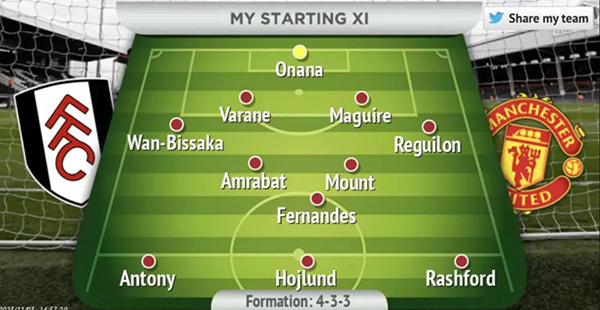 曼联出征富勒姆22人大名单:奥纳纳,巴因迪尔,汤姆·希顿;万比萨卡,迪奥古·达洛,马奎尔,瓦拉内,埃文斯,雷吉隆;阿姆拉巴特,汉尼拔·梅杰布里,科比·梅诺,麦克托米内,埃里克森,芒特,布鲁诺·费尔南德斯;佩里斯特里,加纳乔,马夏尔,霍伊伦德,拉什福德,安东尼。
