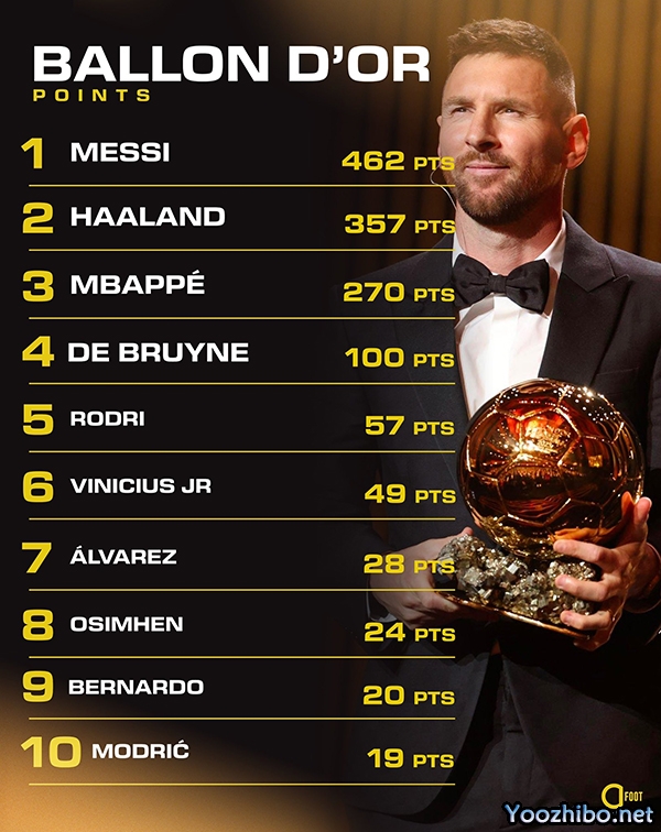 JRS直播网讯 11月4日讯 2023年金球奖30名得分公布,梅西462分夺魁,领先第二哈兰德多达105分。