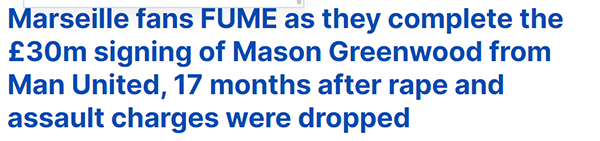 上周,马赛市长敦促俱乐部不要染指青木, 他说:「我不希望我的俱乐部蒙羞。」马赛不为所动,仍然签下了这位22岁的英格兰前锋,并给予他10号球衣。有些球迷在机场迎接曼联天才的到来,但同样多的人怒火中烧:「从来没有像现在这样羞于支持这家俱乐部。看到这个人身穿我们的队服,我觉得很恶心,看到他受到一些人的辩护甚至支持,我感到作呕。」