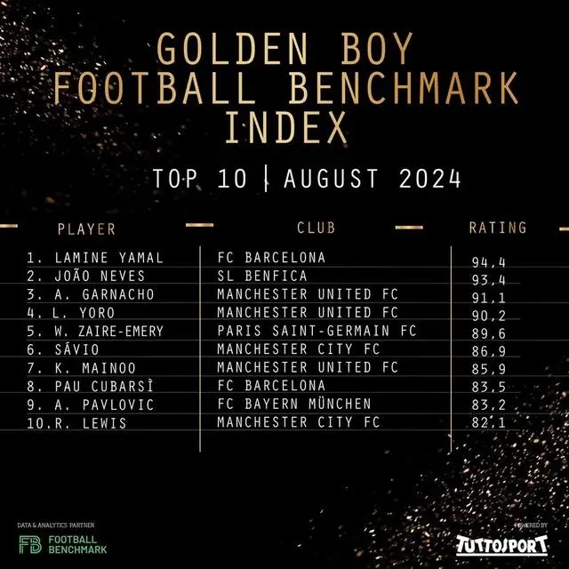 JRS直播网讯 金童奖官方公布了入围球员8月份的表现分,亚马尔仍然高居榜首。