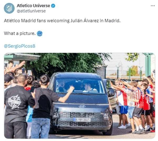众多马竞球迷早早守候在此,以夹道欢迎的方式迎接这位新成员的到来。此前有消息称,阿尔瓦雷斯的转会费总计高达 9500 万欧(7500 万欧 + 2000 万欧浮动),且他将与马竞签订为期五年的合约。