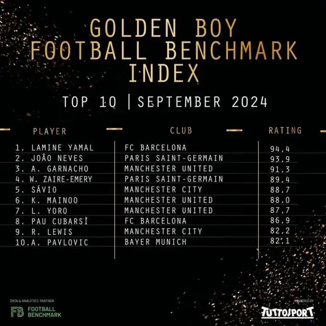 JRS直播网讯 金童奖官方公布了入围球员9月份的表现分,亚马尔仍然高居榜首。