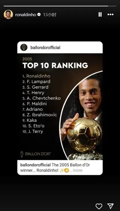 JRS直播网讯 小罗晒自己2005年获得金球奖时的前10榜单,什么水平?