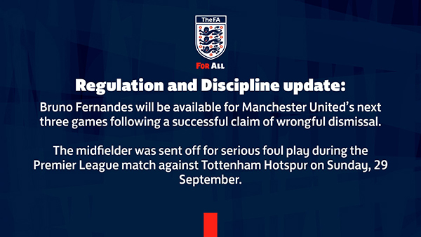 30岁的B费滑倒后继续向热刺中场麦迪逊伸出右脚铲球,脚背外侧踢倒了对手。主裁克里斯·卡瓦纳直接出示红牌将之罚下,赛后B费和滕哈格都认为只是黄牌动作。因此,曼联赛后提出了上诉,英足总现在确认,红魔队长无需停赛3场。据英足总声明指出,委员会认为红牌是错误的量刑,因此予以取消。
