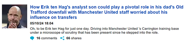 尤其在英力士引进新的足球管理团队之前,俱乐部工作人员对滕哈格之子对转会的潜在影响表示担忧。曼联主帅的儿子奈杰尔,受雇于SEG,担任表现分析师。滕哈格执教期间,尤其是前两年,SEG一直深度参与曼联的转会交易。