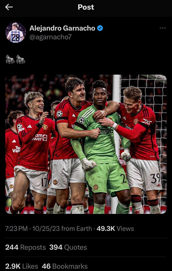 阿根廷小将很快发现了问题,删除了大猩猩,只保留了自己与奥纳纳庆祝的照片,但最终选择完全删除。帖子是在英国时间周二午夜过后发布的,大约15分钟后被彻底删除。