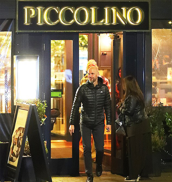 曼联主帅出现在他最喜欢的意大利餐厅「Piccolino」,表现得很轻松,他们离开餐厅已经8点10分,曼城的比赛已经开始了。滕哈格离开时还为其他食客打开了大门,但对方也很谦让,坚持他先走。