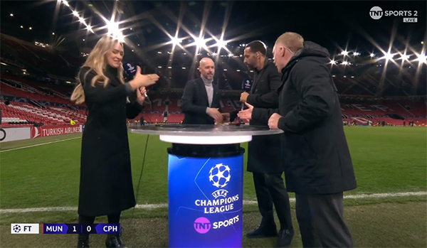 滕哈格此举或许是弥补前一天晚上在欧冠赛后的「失礼」,当时他接受TNT体育节目主持人劳拉·伍兹采访,无意中无视了她的握手。