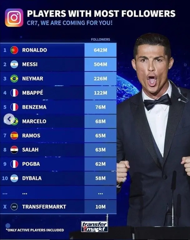 JRS直播网讯德转统计现役球员ins粉丝数,C罗、梅西位列前二,内马尔第三,姆巴佩第四。