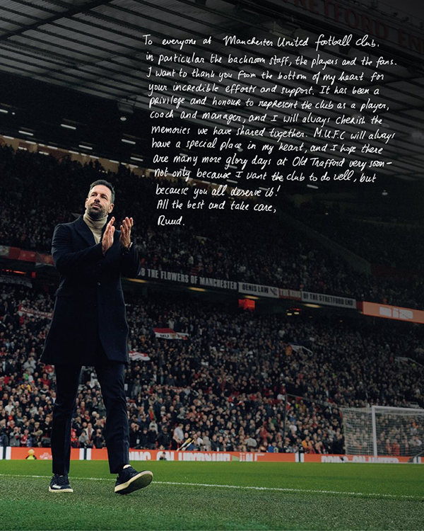 范尼写道:「致曼联足球俱乐部所有人,尤其是幕后工作人员、球员和球迷,我要衷心感谢你们不可思议的努力和支持。先后作为球员、教练和主帅效力俱乐部,是一种荣幸,我将永远珍惜我们一起分享的回忆。曼联在我心中永远有一个特殊的位置,我希望老特拉福德很快会迎来有更多辉煌的日子。不仅因为我希望俱乐部做得更好,而且因为你们都值得拥有!一切顺利,保重。路德敬上。」