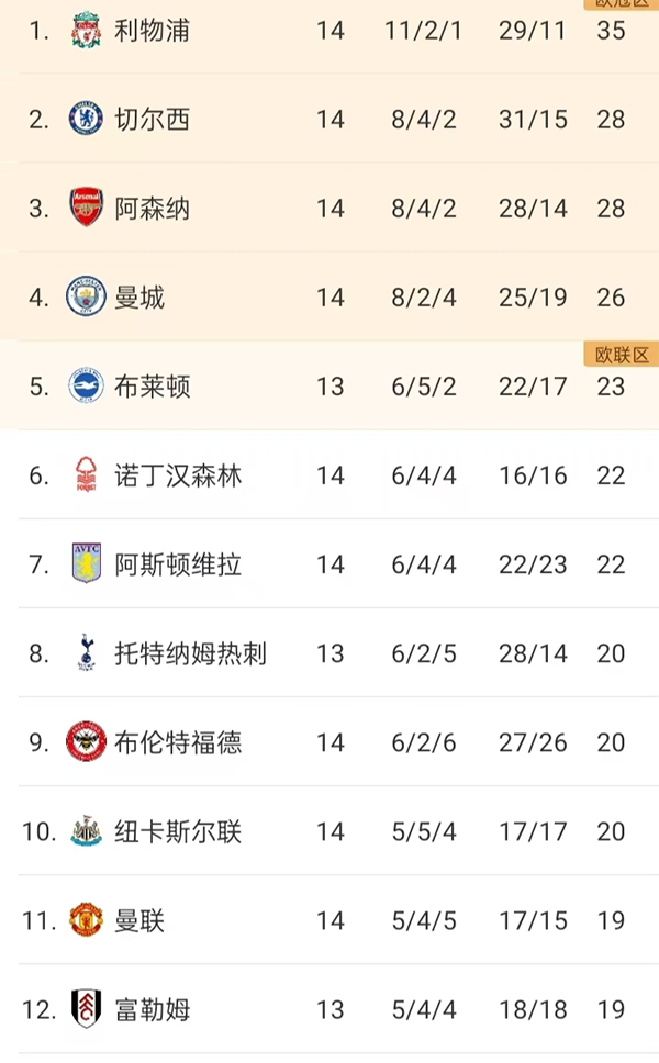 JRS直播网讯北京时间12月5日,英超结束了第14轮的多场比赛。本轮比赛,领头羊利物浦爆冷被纽卡逼平,领先优势缩至7分。而卫冕冠军曼城终结4连败触底反弹,切尔西、阿森纳则继续取胜,在积分榜紧追利物浦。