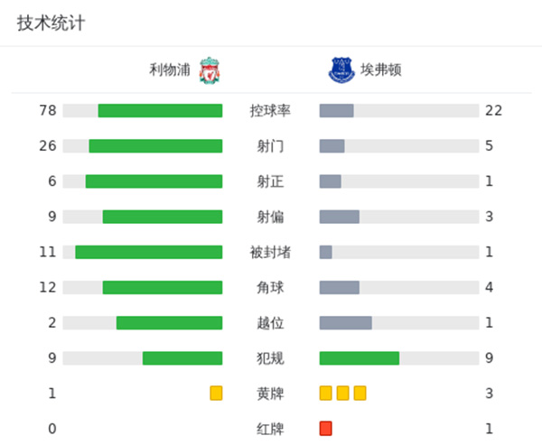 最终全场比赛结束,利物浦2-0埃弗顿。