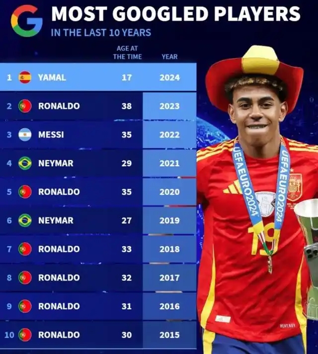 JRS直播网讯《转会市场》统计了近10年谷歌被搜索最多球员情况,C罗6次登顶。